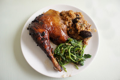 I wanted something special for this cockerel. Something to be a centre piece, to have everyone ooh'ing and ahhing over it, and something different from your usual. I decided to stuff it. Glutinous rice studded with sweet, porky Chinese sausage would soak up the fat from the bird well. Flavoured with shiitake mushrooms, made plump by the cock's juices (stop it) and finished off with a little dried mandarin peel for a tart dimension, this is quite a traditional Chinese dish. The skin is marinated in aromatics and basted well and often for a deep chrome colour. A little rice, some chicken and greenery made a different kind of Sunday roast, but a gorgeous one nonetheless. This beast feeds 6; at £8.50 / kg you can buy them here. You don't have to get yours with guts and claws.