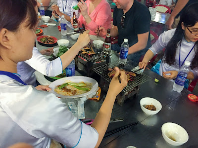 We were given plates of grilled frog, complete with crisp skin, which tastes just like chicken with fish skin attached to it. We got stuck in but others weren't going near it. Skewers of prawns were barbecued and dextrously relieved of their shells with scissors, for us to eat like lollipops off the stick.