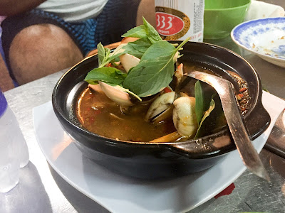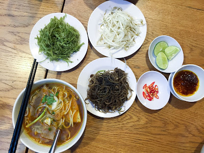 The next morning, we had better success with finding our establishment of choice, Pho Thanh Canh. They've been serving pho for 45 years, and we didn't even have to ask before they furnished us with two bowls of steaming pho (pronounced 'fuh') with slices of beef, a giant basket of herbs, limes, chillis and beansprouts. I can't think of a better breakfast. It seems counter-intuitive to eat hot soup in such heat, but actually it makes you sweat more, thereby allowing you to cool down quicker. Whatever, I'm down with it. Pick a bit of herb for your mouthful, slurp it down, repeat. Sawleaf and basil are in abundance, again more like a vegetable than a garnish that we often associate with herbs. The broth was crystal clear and beefy, the note of aniseed shining through. It was properly restorative. It cost around £1.