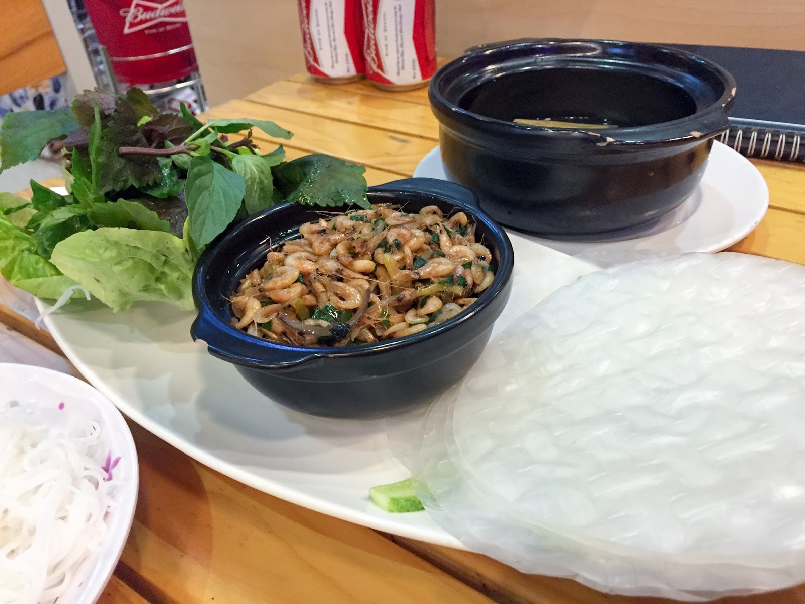 Here, the herb basket was more of a salad, with slivers of banana blossom, mint leaves and chopped lettuce on each table. The noodles we had were bun cha ca (bun referring to the round noodles, ca being fish) and were made up of balls of minced prawn and fishcakes, sliced into the soup. We were having a brothy day.