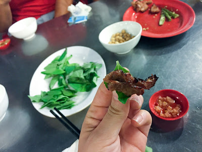 We were not to do any cooking ourselves, and instead our scooter drivers diligently cooked up the food for us, describing what each thing was and how to eat it. It was here we discovered 'fish herb', Diep Cá in Vietnamese, here wrapping the grilled goat. We were told it is an acquired taste; it is not a taste I have acquired. It's disgusting. It's hard to describe, but it's slightly fishy, a bit metallic. From this point on we often found it lurking in dishes and one bite of it is enough to ruin a mouthful and have me reaching for water. Foul stuff.