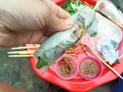 We pointed to the dish the two local men sitting next to us were eating - what looked like a pile of salad in rice paper rolls, and we were given a plate of raw marinated anchovies mingled amongst it. The dreaded fish leaf was present and needed to be picked out, but otherwise I loved this; it was an enormous portion, but each bit had a different assortment of herbs. I've never seen rice paper like it; usually as with making summer rolls you need to dip them in hot water, but these were perfectly pliable and delicate without and needed but filling. Our local buddies next to us were impressed and started taking photos with us and of us. We smiled politely and concentrated on our rolling.
