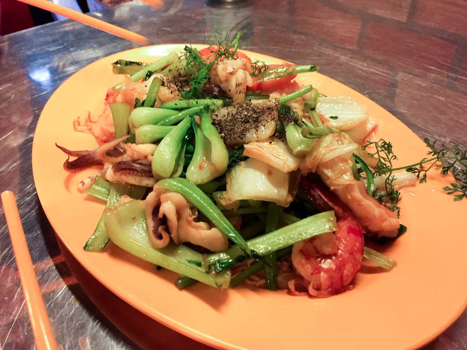 Cau lau is a mixed noodle dish, as opposed to a noodle soup. The thick, chewy noodles are dressed with a thick, flavoursome lard-heavy pork stock, topped with beansprouts, pork and fried pork rinds. Herbs, of course; lettuce, coriander, sometimes mint and the dreaded fish leaf. Chillis on the side to be mashed up with lime juice and to season each mouthful as a par for course.