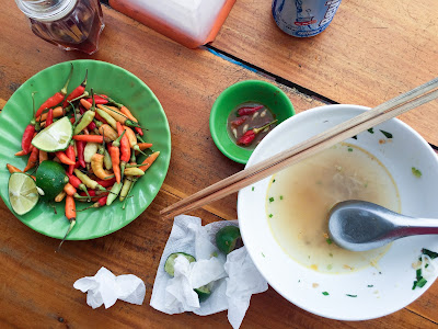 On my way back into town, I pedalled past a bustling wet market and lots of people sitting to eat. I screeched to a halt, parked up my bike and nosed around. I'm not sure the locals this far out of the old town had much experience with tourists, as I was a real hit - eyes followed me everywhere, but not unpleasantly. More curiosity. I sat down with my pick n' mix lunch, and an old lady gestured towards a giant pile of birds eye chillis, beckoning one. I handed a couple to her, and with a toothy grin she chomped it right in half, chewing the chilli. When she offered me the other chilli, well - who was I to decline her hospitality and say no? I chomped it in half and chewed. Jesus Christ. JESUS CHRIST. She looked so impressed it was almost worth it. My nuanced flavours of caramel pork, egg, deep fried fish cake and rice were obliterated. But I'd made friends.