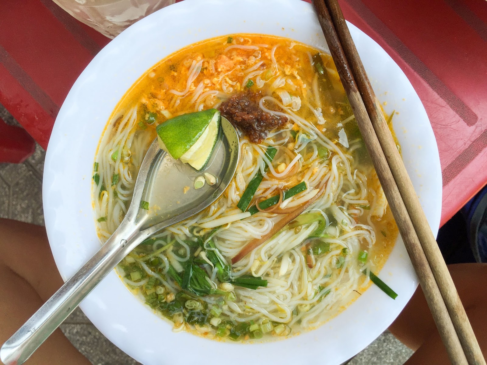 What absolutely did blow my mind, though, was this lady. I wouldn't have given it a second look except I spotted a man perched with her, and the number of tiny bowls piled up in front of him was almost comical. What could be worth eating over and over again 10 times? Called Banh Beo, it's a steamed rice cake, topped with a rich pork and crab broth, and deep fried cao lau noodles. Crunchy, creamy, bouncy. The real kicker was white vinegar and green chillis, which the lady initially splashed on cautiously, until under encouragement, more freely. It was incredible.
