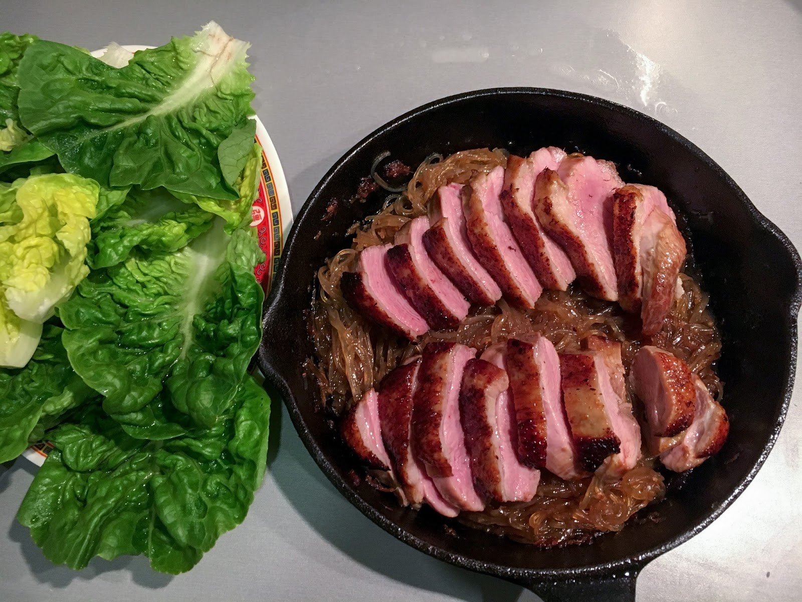 Slice the duck breast finely and place back over the noodles to serve with the lettuce, sauces, and kimchi. Assemble the perfect mouthful with a lettuce leaf, some glass noodles, a slice of duck and whichever sauces take your fancy. Serve with napkins.