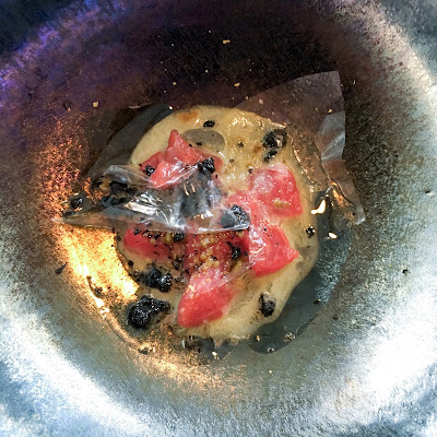 Kashmiri lamb shank rogan josh arrived whole, on the bone, resplendent and bathed in sauce, slivered ginger on top for fresh zing. Fluffy naan bread to mop, and a side combo of aubergine masala, tadka dal and samosa chat. God that was good; the samosa came nestled in a fresh, herbal green sauce and shaved coconut. The dal was soothing to the spicy, creamy aubergine masala. More bread mopping. That lamb shank though, a bit one-note. Not much depth too it. And, oh - £20.50 total for the order is a bit punchy.